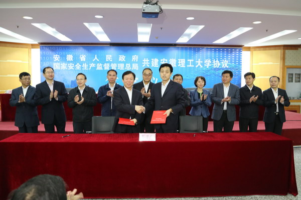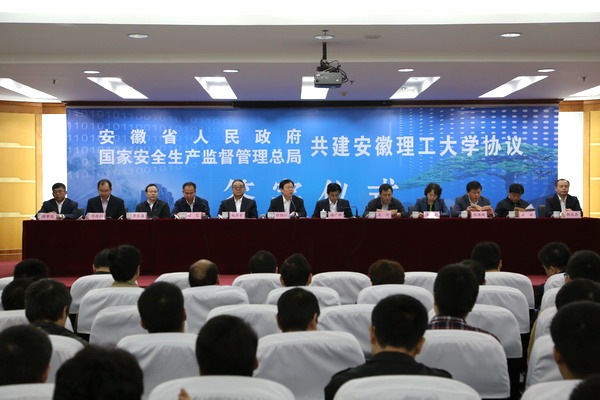 谢广祥、徐绍川分别代表安徽省人民政府和国家安全生产监督管理总局共同签署省局共建安徽理工大学协议。