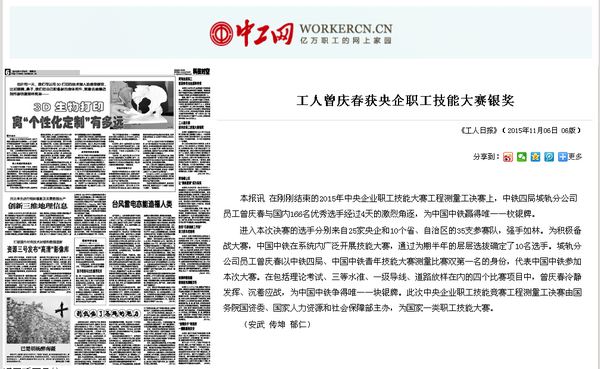 在刚刚结束的2015年中央企业职工技能大赛工程测量工决赛上,中铁四局城轨分公司员工曾庆春与国内166名优秀选手经过4天的激烈角逐,为中国中铁赢得唯一一枚银牌。