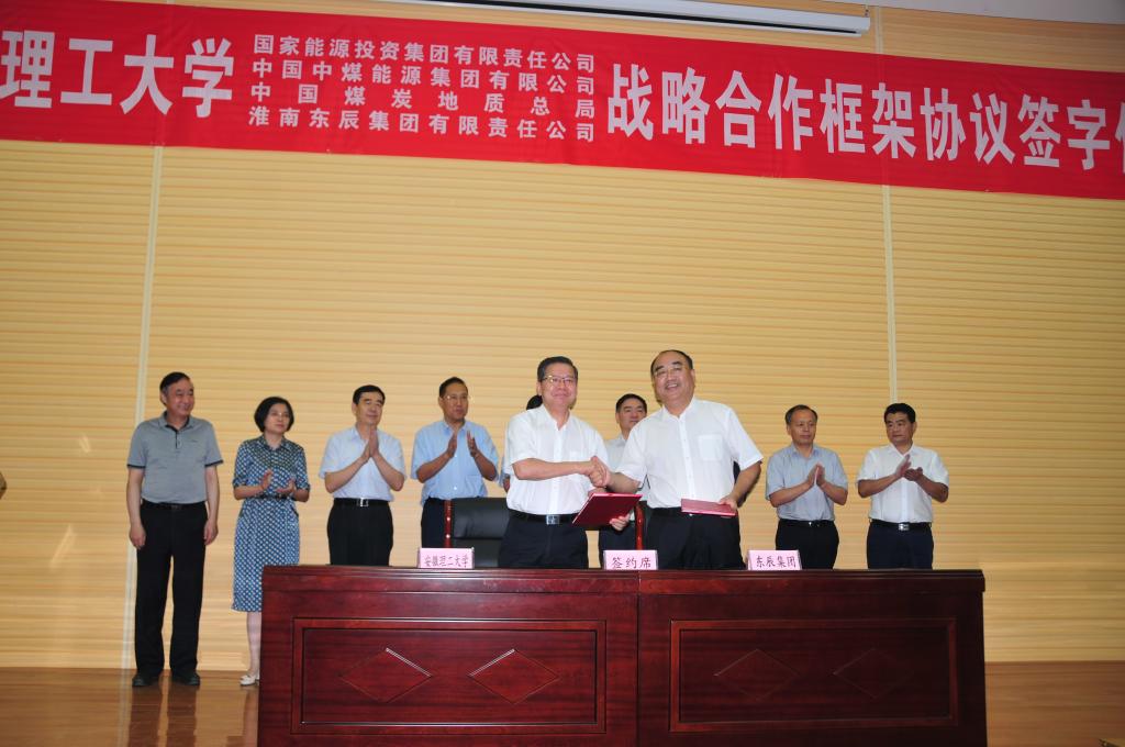 8月7日下午,安徽理工大学与国家能源投资集团有限责任公司、中国中煤能源集团有限公司、中国煤炭地质总局、淮南东辰集团有限责任公司战略合作框架协议签署仪式,以及安徽煤系固废物综合利用与采煤沉陷综合治理研究院成立揭牌仪式在校国家重点实验室一号会议室举行。特邀嘉宾:安徽省政协副主席、安徽省教育厅厅长李和平,中国工程院谢克昌院士、彭苏萍院士、段宁院士、王双明院士,淮南市副市长陆晞;四家签约企业负责人:国家能源集团党组副书记、总经理凌文院士,中国中煤能源集团有限公司总工程师祁和刚,中国煤炭地质总局党委副书记、副局长任辉,淮南东辰集团有限责任公司党委书记、董事长李懋;在校校领导:郭永存、袁亮、郑明东、吴照明、宫能平出席签约仪式。