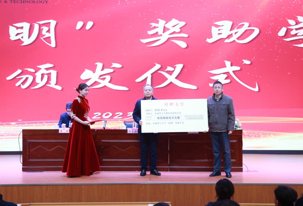 12月19日下午,安徽理工大学“光明”奖助学金颁发仪式在舜耕会堂隆重举行。校党委书记郭永存,“光明”奖助学金设立者、机制82级校友、东莞市科力线材技术有限公司董事长沈德才出席活动。仪式由校党委常委、副校长董雨主持。