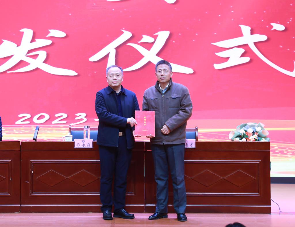 仪式上,郭永存代表学校接受捐赠,并向沈德才颁发捐赠证书。董雨宣读了《关于表彰2022-2023学年“光明”奖助学金先进个人的决定》。本年度共有46名大学生获得“光明”奖学金,58名大学生获得“光明”助学金。沈德才为同学们颁发奖助学金。