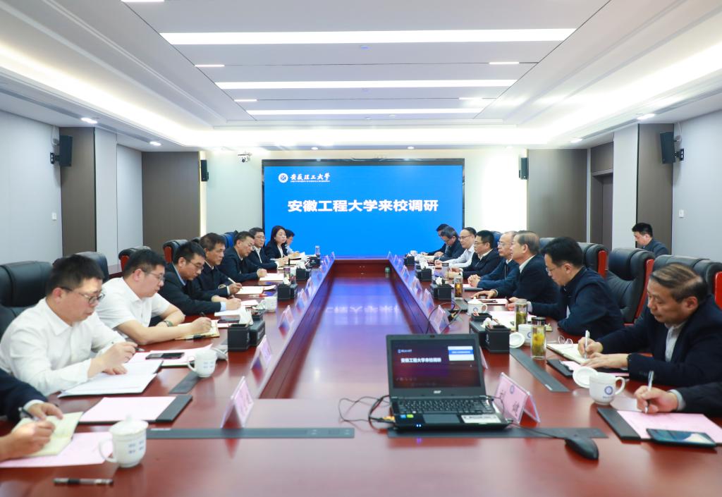 郭永存对卢平、黄友锐一行来校调研交流表示欢迎。他表示,安徽工程大学是一所以工为主的省属多科性高等院校,办学历史悠久,优势特色显著,学生创新创业、省内科研成绩突出,值得学习借鉴,希望进一步深化合作交流,促进双方共同发展。