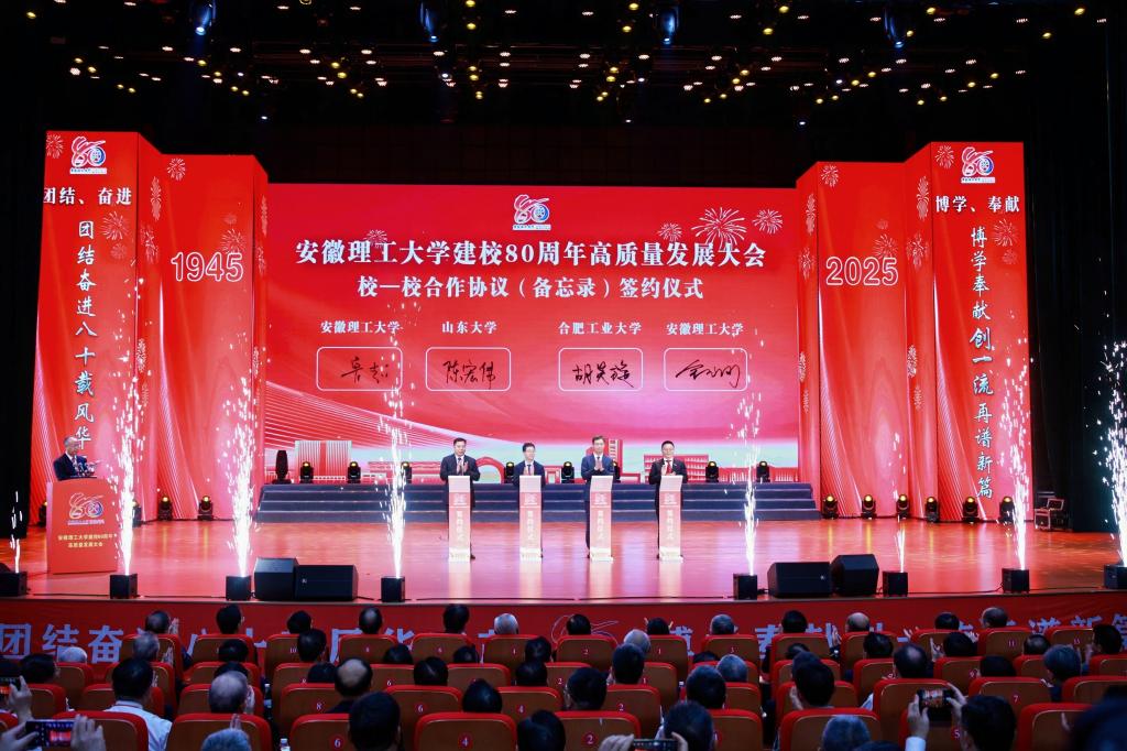 安徽大学党委书记虞宝桃代表兄弟高校致辞,向安徽理工大学全体师生员工、海内外校友致以热烈祝贺和美好祝愿。他指出,80年来,安徽理工大学坚持以“工业报国、能源强国”为己任,已发展成为一所工科见长、特色鲜明、创新活跃的省属高水平大学。回望来时路,两校共同为区域建设发展作出了重要贡献。砥砺奋斗路,两校始终相互支持、深化交流合作。奋进新征程,期待与安徽理工大学携手并肩,一体推进教育发展、科技创新、人才培养,为加快打造“三地一区”赋能助力!他表示,安徽大学将一如既往与安徽理工大学等兄弟高校一道,用不负时代、不负人民的新成绩赓续巍巍学府的新荣光!