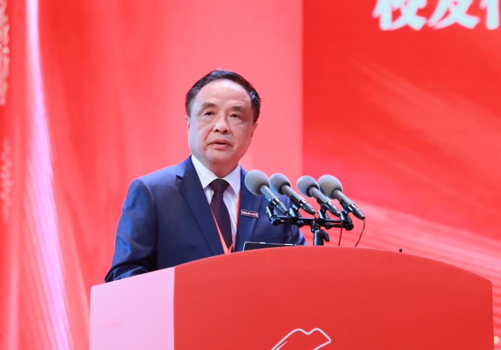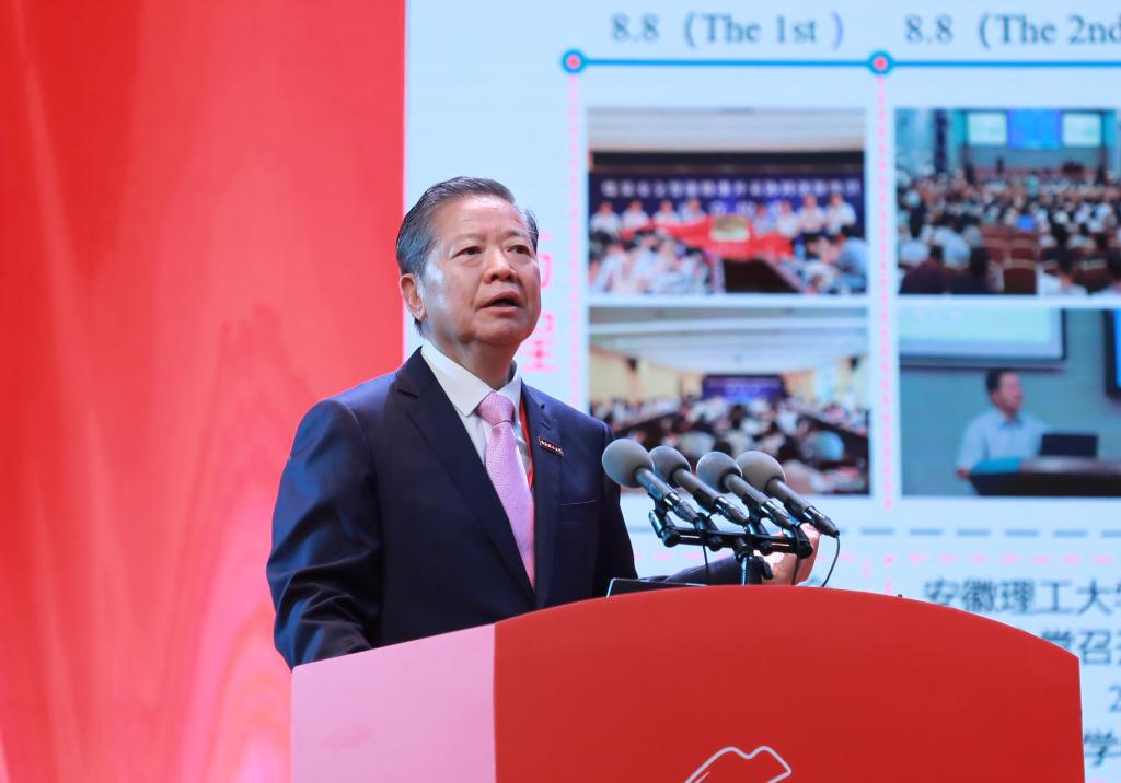 任泽锋代表淮南市委、市政府,向安徽理工大学全体师生员工和广大校友致以热烈祝贺。他指出,安徽理工大学始终秉持教育报国初心,已逐步发展成为行业特色鲜明、创新氛围浓厚、育人成效显著的省属高水平大学。当前,淮南市正在全面贯彻落实习近平总书记考察安徽重要讲话精神,持续深化五大行动,亟需科技、人才支撑。希望安徽理工大学以建校80周年为新起点,认真贯彻落实全国教育大会精神,坚持和加强党的全面领导,推动“双一流”创建取得新的更大突破。期待学校以更大力度投身淮南建设,拓宽合作领域,推动融合发展,多出创新成果,多献良言实策,共同打造校地共建新典范。他表示,从“物理相加”升华为“化学相融”,市校是命运共同体与事业合伙人,淮南市委、市政府将始终坚持校地一家、同心共赢的理念,一如既往支持学校建设与发展。