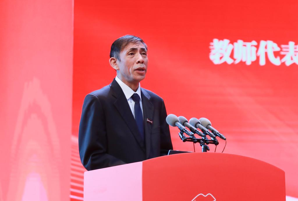 国家级人才、学校精准医学创新研究院王文新教授作为教师代表发言。他指出,站在学校建校80周年的历史节点,深切感受到学校“深耕煤海、为国奉献”的初心,学校搭建的跨学科平台,联动医学、材料、人工智能等学科及附属医院,让精准医学创新研究院从蓝图变为创新沃土。他表示,八十年既是荣耀丰碑,更是奋进序章,我们将以“团结奋进”为笔,以“博学奉献”为墨,以“理工医交叉、医教研协同”为径,弘扬教育家精神和科学家精神,推动高分子材料与智能医学深度交融,让科研成果真正守护劳动者生命安全,在“双一流”征程中续写更多“从0到1”的突破,为强国建设贡献安理力量!