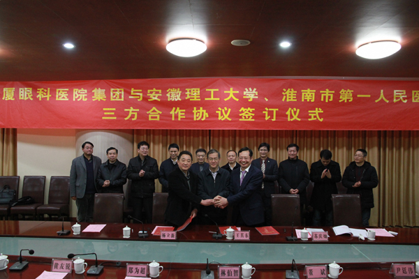 2月21日下午,我校与华厦眼科医院集团、淮南市第一人民医院三方合作协议签字仪式在淮南新锦江宾馆第2会议室举行。华厦眼科医院集团董事长苏庆灿,淮南市第一人民医院党委书记、院长杨立新,校党委书记郭永存教授、校长王其东教授出席签字仪式。仪式由第一临床医学院名誉院长、市政协副主席、市卫生与计划生育委员会主任方严主持。